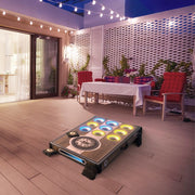 This isn’t your typical cornhole board! This is Hole-E-Moley™, a one-of-a-kind electronic bag toss game with interactive LED targets and auto-scoring that syncs with an app.