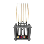 The rectangle floor rack can hold 8 cues, a 9-ball rack, a triangle, and a set of balls. It is a great way to store and organize game equipment. It can be placed anywhere along a wall or in a corner within easy reach of the pool table.