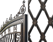 The Bridgeton Moore Aluminum Estate Entry Gate and Fencing Collection offers an Elegant Design. It is an investment in a quality that adds value to your property and makes your home more beautiful and secure. It is also, the only complete estate system of its kind, cast in Aluminum, a system that will never rust. This particular item is the Bridgeton Moore Complete Wide Driveway Entry Gate System 242 Inches Wide, dimensions from outer edge of post to post are 242" wide 16 “ deep X 85" tall providing a 220 “ ( 18’) wide opening. Designed and cast in 100% aluminum that will never rust requiring little to no assembly. The finish is a rich brown bronzed tone with hand brushed highlights that accent the details and then a long lasting double powder coat finish is applied, making this the longest lasting, lowest maintenance, easiest to install, turn-key system in the market for any price. Comprised of a left and a right gate which comes pre-mounted to their respective posts each with a pre-mounted welded wheel for smooth operation and the posts where designed to mount easily to the provided mounting spike. Owners, installers and especially do it yourselfers will love the ease of installation that the systems design and provided mounting spike offers making the installation of such a beautiful gate system as easy as banging the spikes into the ground and then just bolting the post to it, the bottom of post and the top of the mounting spike have pre-drilled holes that will align with each other for bolting down. Note * If the location of installation does not offer a solid soil or for those simply wishing a more permanent installation floating and leveling the mounting spike first into a 16” square or round x 30 “ deep concrete form is advised once hardened you can then bolt the post to the spike ( when leveling your mounting spike leave enough room above the concrete for connecting your bolts, you can fill in this gap with anything appropriate to match the area after connections are made. The decorative scrolls on top of the gates are shipped separately for safety and need to be simply attached. The Bridgeton Moore Estate System is a traditional and exclusive collection of beautiful Driveway and Entry Gates, Fencing, Railings, Posts and Lights cast in 100 % Aluminum. Bridgeton Moore has taken 10 years of developing and evolving this to be the finest most complete system in the market and finally replacing what was only previously available in cast Iron. This intricate level of design and this complete of a collection had never before been available in Aluminum. It required a upfront multi-million dollar investment in giant die cut steel molds to cast the first gate, but now Bridgeton Moore can precision cast each piece efficiently and in their entirety. Aluminum is the best metal for outdoor use 1)….. It doesn’t rust 2) …..The finished product is 1/3 rd lighter in weight then iron, especially important when developing a gate that can be installed easily and operates over long periods of time off hinges and on wheels and 3)……. Will create significant less resistance in the long term use when installing a remote controlled gate opener ( sold separately).