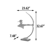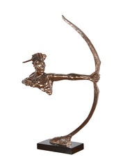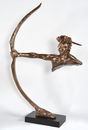 Our Bronzed Indian Shooter at 22 wide x 6 deep x 33 Tall is a top seller from our popular Platine Metal Series. The artist was able to create with the use of the Bow a free floating depiction of this desirable Indian Warrior. The original design was Artist sculpted and then hand cast in Polyresin. The finished product comes mounted to a Black base. It features our special and rich Platine metal plated finish. A finish that enables the artists to burnish and polish the details creating a very expensive looking yet affordable decorative art sculpture.