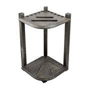 Solid wood corner cue rack with double thick design. The top of the rack has slots to hold the triangle and 9 ball rack. Measures 15" x 15" x 28" high. Holds a set of balls and 10 cues.