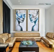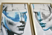 This captivating set of two modern portraits features abstract female faces rendered in striking tones of blue, black, and white. The bold brushwork and fluid blending create a sense of movement, while the metallic gold frames add a touch of sophistication. The partial abstraction over the eyes gives each piece a mysterious, avant-garde quality, making them perfect for contemporary spaces that value both elegance and edge. Whether displayed together or separately, these artworks will instantly become the focal point of any room.