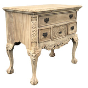A lovely Hand Carved and Hand Finished Natural Mahogany Chippendale Style Low Boy with five drawers along blockfront, brass pulls cabriole legs ending in ball-and-claw feet. Featuring beautifully-articulated carvings throughout which include gadrooning, swags, scallop shells and acanthus leaves on front, apron and knees recreated after the original circa 1870. This beautiful recreation has offered a variety of function for centuries in American Homes perhaps as a console in a foyer, a nightstand in a bedroom, or an end table in a living room. But our Heritage version is especially interesting with its fashionable and current hand finishing style. This low boy features an open grain wood seasoned finish, a finish that brings this popular antique design of yesteryear into a valuable and stylish member of today’s fashionable home trends.