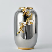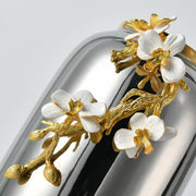 Part of the exquisite Orchid Bloom Collection, the Orchid Bloom Polished Vase blends bold modern design with botanical elegance. This reflective silver tone vase features a smooth, high shine finish, adorned with a sculptural golden branch and hand painted white orchid blooms. A gold rim and base add extra refinement to this striking piece.