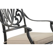 Introducing the Outdoor Estate Dining Swivel Armchair Aluminum, an enduring seating choice from Bridgeton Moore Patio. This cast aluminum chair offers timeless style and functionality, featuring a swivel mechanism for effortless 360-degree rotation and a generous 27.5-inch width for added comfort. Finished in Ebony with soft silver-toned dry brushed accents, this chair exudes elegance. The powder coat sealing ensures the durability of the finish, making it ideal for long-lasting outdoor use in any weather condition. Designed for ultimate comfort, the chair is equipped with special quick-drying cushion cores covered in Sunbrella Endurance fabric. Renowned for its durability, Sunbrella fabric is among the best in the industry for outdoor use. Sunbrella fabrics are colorfast and UV resistant ensuring lasting beauty without fading. Simply remove the covers and wash them; not even bleach will harm the cushion covers. The Elisabeth Swivel Armchair can be used individually or paired with other seating options. A popular choice for the porch, balcony or as part of a larger outdoor dining set, the Elisabeth Swivel Armchair is comfortable and long lasting. Bridgeton Moore stands behind the quality of its products, offering one of the best warranties in the industry. With a 3-year warranty on all frames and finishes under normal conditions, you can trust in the durability and longevity of your investment. Covers are recommended for year-round outdoor exposure, and cleaning the furniture surface of debris will help protect the finish. Experience the perfect blend of functionality, elegance, and comfort, creating unforgettable moments with family and friends.
