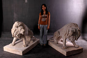 The Pair of 39 inch Symmetrical Entry Lions in Rough Stone stand 52 inches wide X 30 inches deep X 39 inches tall each. The Lions are hand Cast in durable Fiberglass reinforced sandstone and have a lightly aged rough stone finish suitable for outdoor or indoor use. Each Lion mold is expertly carved to capture the greatest attention to detail, such as their muscular deep chested body, short rounded head, ears, and hairy tuft at the end of its tail. The set is one of many life like Animal offerings brought to you exclusively by AFD Home. Collect and display them proudly