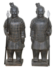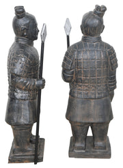 The left and right standing pair of standing terra cotta warriors comes in our black earthy finish 42" tall. The sculptures are individually hand cast and hand finished in a durable fiberglass and cast stone reinforced material. The black earthy finish is durable and offers an authentic antique quality and richness. These recreations of todays' famous terracotta army depict the bravest and most loyal of soldiers from the guards of qin she Huang, the first emperor of China and creator of the qin dynasty. It is said qin, in order to have the same military power and protection in the after life, was buried with 1000's of these soldiers in 210–209 bce who for centuries to come protected the emperor buried, the tomb was discovered in the 1970's by a farmer. These 41" tall smaller sized sculpture are suitable for outdoor or indoor use and could be displayed proudly on the floor or a table top. The set of 2 arrives individually crated and completely assembled with Chinese spears of war mounted in each warriors raised hands.