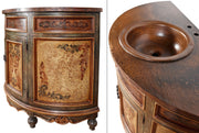 The Peruvian Copper Top Vanity is a 48" wide single bowl vanity. The vanity is beautiful and decorative as well as designed to make installation as easy as possible. It comes with a mounted hand hammered copper top and bowl with pre-drilled holes for faucets the back was designed with an opening to allow for easy plumbing hook-ups. This collection boasts a Spanish influence with its large scaled details in a finish of varying tones of rich darker tones featuring a contrast of distressed creamy beige and delicately detailed with hand painted scrolls. Consider ordering 2 for a large master bath application or for smaller space requirements consider our equally beautiful Lima Copper Top Vanity with an efficient 25" width. The Peruvian Copper Top Vanity is part of our Santa Lucia Collection consisting of handmade, hand painted, and distressed solid wood furniture making each piece a timeless investment. Hand crafted treasures made one piece at a time, under one roof, by our exclusive family owned manufacturer from Lima, Peru. Their master artisans are skilled in furniture making techniques influenced by the Spanish during the colonization of Peru. Many items in the diverse collection feature specialty hand painted finishes that have also been passed on and perfected from generation to generation. The family strives to be environmentally friendly by using woods re-purposed from haciendas and old colonial homes as well as wood indigenous to South American forests, primarily mahogany, cedar, moena and requiem. If you are a lover of beautiful painted furniture, find hill country rustic romantic, or find richness in Mediterranean lore Then you too may fall in furniture love with this fine collection.