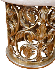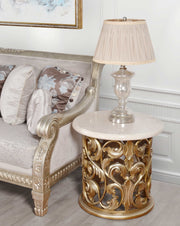 The Platine Hand Carved Round Side Table w Crema Marble 24 Inches Tall is completely Hand Carved from solid Mahogany. Hand Made and Hand Finished by the Master Carvers and Finishers of the Heritage company. Rare to find in this quality of workmanship. The Platine finish with hues of Champagne Golden Silver is equally spectacular, a multi step process of actually silver leafing the frames and layering and finishing techniques. The imported Creama Marfil Top blends tastefully and balances this amazing finishing. While this Side Table is sold separately it is often purchased in pairs for balance and it matches beautifully with the Platine Hand Carved Coffee Table w Crema Marble 48 Inches Wide for a more complete design. The Platine Collection offers many wonderful options to expand your design, consider any of the Platine matching Upholstery and Occasional pieces from this top Quality Collection. All furniture is hand made and finished 1 piece at a time.