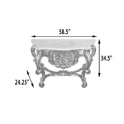 The Platine Hand Carved Vanity w Sink and Cream Marfil Marble Top is a spectacular choice for your custom Vanity. If you find beautifully carved and finished furniture of this design appropriate. It's beautiful and affordable considering its completely Hand Carved from solid Mahogany, offering investment value and enjoyment in any home it gets installed. Hand Made and Hand Finished by the Master Carvers and Finishers of the Heritage company. Rare to find in this quality of workmanship. The Platine finish with hues of Champagne Golden Silver is equally spectacular, a multi step process of actually silver leafing the frames and layering and finishing techniques. The imported Cream Marfil Top blends tastefully and balances this amazing finishing. You will like the fact your vanity comes with a mounted Porcelain Sink and features double thick edged Cream Marfil Marble Top with 3 pre-drilled 8 Inch on center holes for installing standard faucets. Faucet Hardware not provided. The Platine Collection offers many wonderful options to expand your interior designs, consider a matching Bench or Table to complete your Bathroom. There are many Platine matching Upholstery and Occasional pieces from this top Quality Collection. All furniture is hand made and finished 1 piece at a time. Arrives Completely Assembled and Ready for your Plumbing. Enjoy!