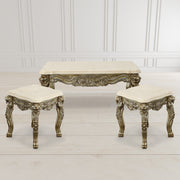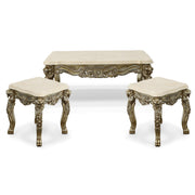Your home really is your Castle when you decorate with this New and Exclusive Neoclassical Platine Lion Coffee Table Set of 3 Hand Carved Mahogany with Cream Marfil Marble Tops. Set of 3 Incudes a 51.5 Inch Long Platine Lion Coffee Table Hand Carved Mahogany with Cream Marfil Marble Top and 2 Platine Lion Side Table Hand Carved Mahogany with Cream Marfil Marble Top 26 Inch Tall Hand Made and Hand Finished by the Master Carvers and Finishers of the Heritage company. A Neo-classical design boasting extensive hand carvings of Lion Masks, Crests, Flowers and scrolls, rare to find in this quality of hand carved workmanship. The Platine finish offers hues of Champagne Golden Silver is equally spectacular, a multi step process of actually silver leafing the frames and layering and finishing techniques. The imported scalloped double edge Cream Marfil Marble Top blends tastefully and balances this amazing finishing. The Platine Collection offers many wonderful options to expand your table set, Consider adding the matching Sofa Table Console or any of the Platine matching Upholstery or Occasional pieces from this top Collection. All furniture is hand made and finished 1 piece at a time.