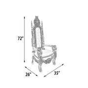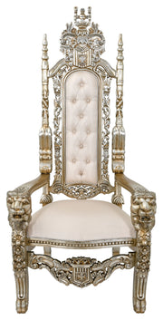 The Platine Lion King Chair is a palatial 36 wide 28 deep x 72 tall inches. The chair is tall and impressive, and few chairs make more of a statement, with fine hand carved details on both the front as well as the back and carved regal lion masks flanking each arm, all of which adds to the prominence. This regal seat is fully upholstered and covered in a thick woven linen, which is neutral for ease of placement, and that works beautifully with the chairs specialty finish. The finish is Platine Lion King Chair, a trending tone, popular with many interior designers that lighten and lends richness in a soft yet luxurious way. The specialty finish used combines hand applied layering, glazing, padding, and distressing techniques. Heritage Furniture is built in a rare quality of yesteryear that will last for generations of ownership. The special Mahogany wood used comes from replanted forests; the selected wood has been kiln dried. The item in its final form is stress and pressure tested prior to finishing to ensure long lasting stability in most all climates, a Heritage Brand standard. Sold separately but often ordered in pairs for special uses as Wedding Throne Chairs, and while they are a solution to offer the feeling of luxury at special Events, these chairs can be purchased and appreciated by the select few for all times. The chairs are from the new Platine finish series, which offers many accompanying items that can be combined to expand your interior or collections. Made by hand and imported from Indonesia. This popular Throne Chair comes in several Heritage Finishes to choose from.