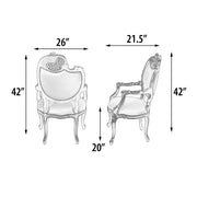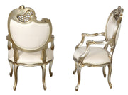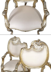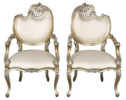 Pair of French Rococo Mahogany Fire Side Chairs in Platina Silver Finish each measuring 26 width x 24.5 depth x 42.5 tall inches. They are a beautiful example of a style of furnishings, originating in France about 1720, evolved from Baroque styling, Rococo style was an evolvement of elegant refinement and a more delicate overall effect. This pair of chairs offered were designed as a set with symmetrical carvings. The chairs are hand carved out of solid Mahogany that is then tastefully finished in our Platina finish and upholstered with an imported Silver Taffeta fabric. Another exclusive design and finish from our Heritage Collection, a collection of fine, hand made furniture in the purest of standards of age old traditional crafting. Each piece is hand carved, one piece at a time, by some of the world's best carvers. The special Mahogany wood comes from replanted forests. The selected wood has been kiln dried. The item in its final form is stress and pressure tested prior to finishing to ensure long lasting stability, in most all climates, a Heritage Brand standard. The Platina finish series which offers many accompanying items to these chairs that can be considered and combined to expand your desired interior. The chairs come fully assembled, a process of finer construction offering a more stable seating. Made by hand and imported from Indonesia.
