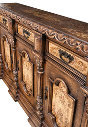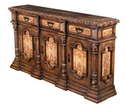 The Juliana Buffet is a large and impressive cabinet from Peru and part of our new Juliana Series. This cabinet stands a magnificent 80.00 Long x 14.50 Depth x 45.00 Inches Tall. This series boasts a Spanish influence with large scaled details and its multi layered finish of light and dark sienna and brown tones with subtle natural contrasts resulting from hand rubbing and exposing the rich wood undertones then delicately detailed with hand painted soft scrolls. The Buffet/ Sideboard is a perfect addition from the Juliana series, a complete collection offering a spectacular dining table, Bench and Buffet options. The Juliana series is a collection from our Santa Lucia Collection which consists of handmade, hand painted, and distressed solid wood furniture making each piece a timeless investment. Hand crafted treasures made one piece at a time, under one roof, by our exclusive family owned manufacturer from Lima, Peru. Their master artisans are skilled in furniture making techniques influenced by the Spanish during the colonization of Peru. Many items in the diverse collection feature specialty hand painted finishes that have also been passed on and perfected from generation to generation. The family strives to be environmentally friendly by using woods re-purposed from haciendas and old colonial homes as well as wood indigenous to South American forests, primarily mahogany, cedar, mean and requiem. If you are a lover of beautiful painted furniture, find hill country rustic romantic, or find richness in Mediterranean lore Then you too may fall in furniture love with this fine collection.
