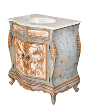 The Serena Vanity from our Serena Series is a 33" wide single bowl vanity. The vanity is beautiful and decorative as well as designed to make installation as easy as possible. It comes with a mounted beige solid marble top with pre-drilled holes for faucets, a mounted porcelain bowl and the back was designed with an opening to allow for easy plumbing hook-ups. This collection boasts a Spanish and French influence with its large scaled details in a finish of varying tones of soft bleus featuring a contrast of distressed creamy whites and delicately detailed with hand painted soft scrolls. Consider ordering 2 for a large master bath application. The Serena series is part of our Santa Lucia Collection consisting of handmade, hand painted, and distressed solid wood furniture making each piece a timeless investment. Hand crafted treasures made one piece at a time, under one roof, by our exclusive family owned manufacturer from Lima, Peru. Their master artisans are skilled in furniture making techniques influenced by the Spanish during the colonization of Peru. Many items in the diverse collection feature specialty hand painted finishes that have also been passed on and perfected from generation to generation. The family strives to be environmentally friendly by using woods re-purposed from haciendas and old colonial homes as well as wood indigenous to South American forests, primarily mahogany, cedar, moena and requiem. If you are a lover of beautiful painted furniture, find hill country rustic romantic, or find richness in Mediterranean lore Then you too may fall in furniture love with this fine collection.