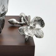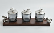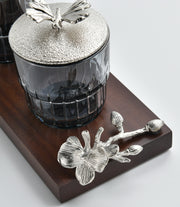 Elevate your tabletop elegance with the Silver Monarch Butterfly Jar Set — a striking trio of glass jars nestled on a rich wooden tray, each crowned with a textured silver lid adorned by a delicate monarch butterfly finial. The smoke tinted glass adds a modern edge, while the ornate silver floral accents on each end of the tray bring a timeless charm.