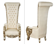 The Spectacular Palace Platine High Back Chair 74 Inches Grand. It is one of the most impressive and opulent Grand scale Chairs in the Market. This design is also very popular with our Wedding and Events specialists as special Wedding Throne Chairs. Hand Made and Hand Finished by the Master Carvers and Finishers of the Heritage company. Rare to find in this quality of workmanship. The Platine finish with hues of Champagne Golden Silver is equally spectacular, a multi step process of actually silver leafing the frames and layering and finishing techniques. The imported Taffeta Fabric offers a neutral balance to this amazing finishing. While this Chair is sold separately it is often ordered in pairs for Balance and Symmetry. The Platine Collection offers wonderful options to expand your design and consider any of the Platine matching Upholstery and Occasional furniture pieces from this top Quality Collection. All furniture is hand made and finished 1 piece at a time.