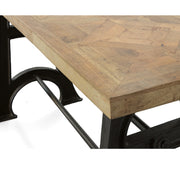 A beautiful and strong Wood and Industrial Iron Mango Parquet Coffee Table 54 Inch. The Cocktail Table Top is built using Solid Mango hardwoods in an artistic parquet design. Naturally finished with a satin sheen that protects and enhances the wood for long term use. The grain of the Mango Wood offers beautiful variations of natural color with rich depth and tone. The top is mounted to an authentic Cast iron Industrial base that is heavy and stable. The base is hand cast in Iron using authentic Industrial molds. The complete table is beautiful and the strength of its construction will offer years and years of use for even the most active of families. Sold separately this table can be ordered and used separately. Consider combining with the matching Wood and Industrial Iron Mango Parquet Lamp Table 24 Inch or the matching Sofa Console table to complete your desired design. Hand Made and Hand Finished in India for AFD Home. Minor Assembly Required.